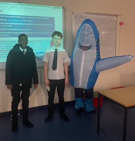 Mrs Lister reports: “To mark the end of their unit on clothing, Year 8 German students put together their own fashion shows. Each group had a couple of models, a compère and a photographer. Each student produced a script, using some guided support and brought in clothes from home for their performance. The audience were then asked to give their feedback in German and score the performance. Much fun was had by all and the shark costume certainly provided some entertainment in the MFL corridor!”